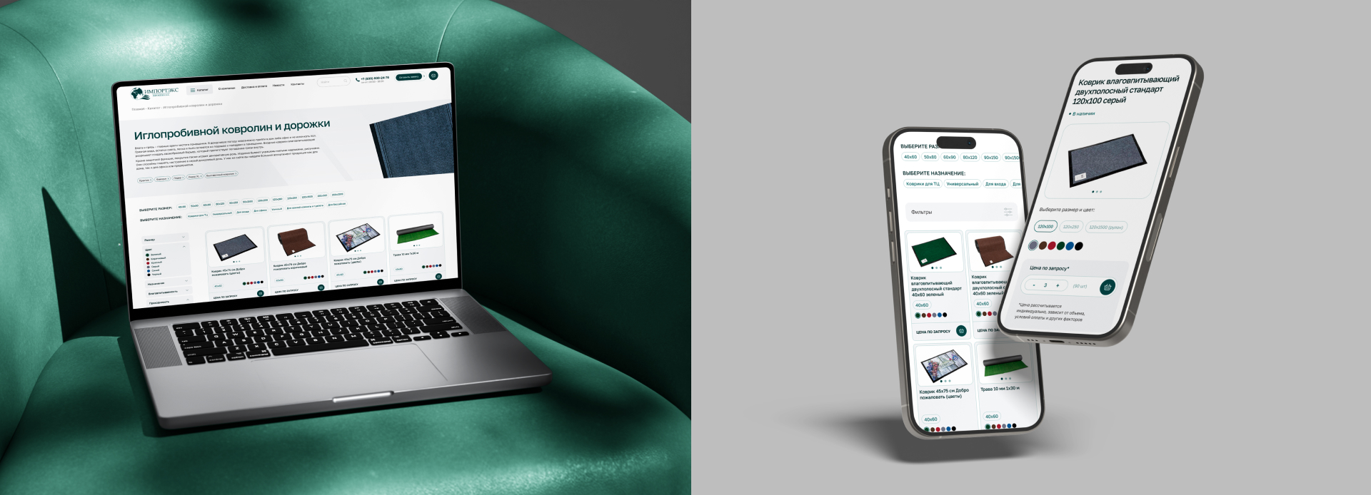 Визуально сайт сделан в спокойной палитре с акцентным зелёным цветом, который используется для навигации, кнопок и ключевых действий. Каталог построен на крупной карточной сетке, без перегруза и второстепенной графики. Большие отступы, простой шрифт делают интерфейс «воздушным» и рабочим — внимание удерживается на выборе товара, фильтрах и формах заявки.