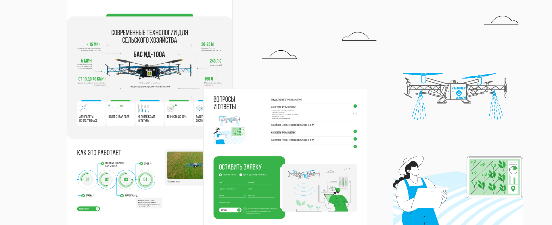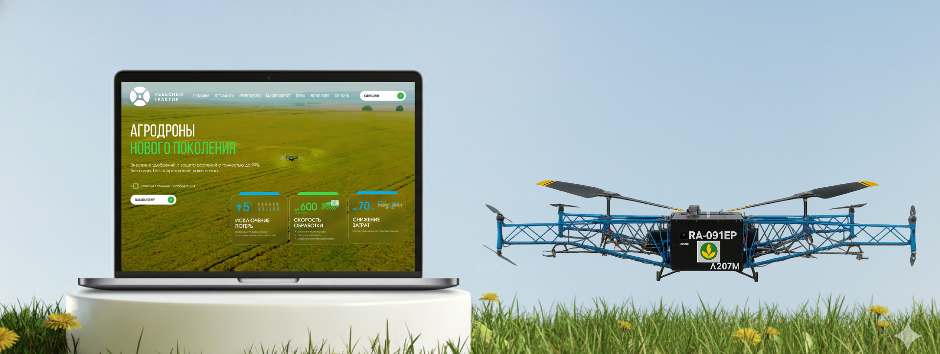 Создать современный лендинг, который покажет преимущества использования дронов в сельском хозяйстве, повысит доверие к компании, продемонстрирует технологичность сервиса и увеличит количество заявок от аграриев.