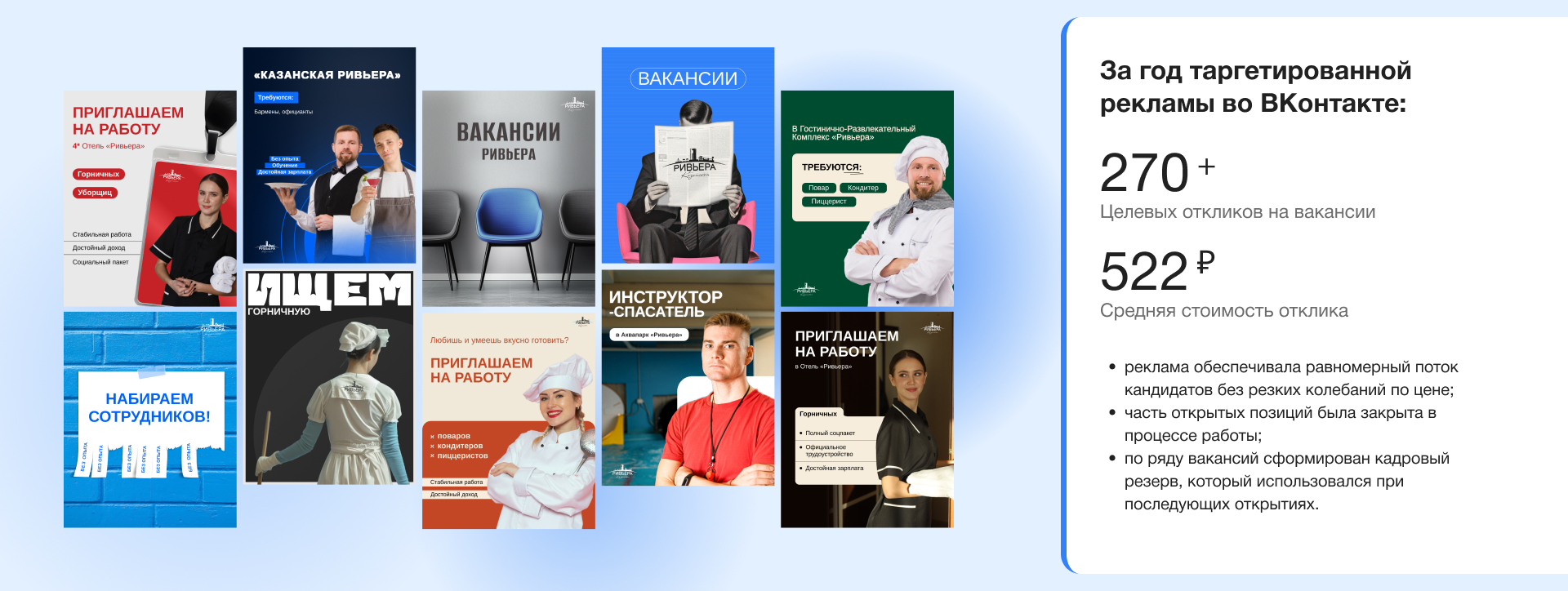 - Запустили и вели таргетированную рекламу во ВКонтакте с фокусом на отклики на вакансии.